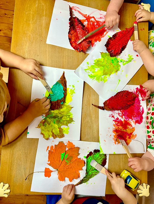 Wir waren zum Blättersammeln 🍁🪣 unterwegs und haben festgestellt, dass der Herbst bunt ist 🍭 – und so heißt es heute: Bunt ist unsere Herbstkunst 🎨! Aus unserer wirklich tollen Blättersammlung suchen wir uns die allerallerschönsten Herbstblätter aus. Dann geht es auch schon los und wir machen noch mehr draus. Es wird gemalt 👩🎨🧑🎨! Herbstblätter, Papierblätter und Farbtöpfe auf den Tisch, Pinsel in die Hände und Phantasie 💭 ausgepackt! Unsere Farben leuchten fast so wie die Herbstblätter! Doch welche Farbe 🌈 nehmen wir, welche gefällt uns Tageskindern jeweils am besten und welche Farben passen gut zusammen? Gar nicht so einfach🧐: Rot und Gelb, Gelb und Grün, Grün und Rot, Rot und Orange? Oder einfach Gelb, Grün, Rot und Orange zusammen – denn unser Motto heute ist doch: Bunt ist unsere Herbstkunst 🤗!